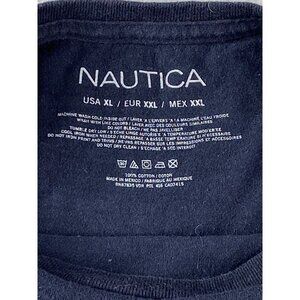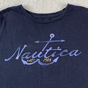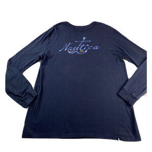 Nautica Shirt Mens Large Navy Blue Long Sleeve Spell Out Cotton Tagless Tee Y2K