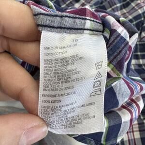Classic fit style with a multi-color plaid pattern featuring blue, red, green, and white tones.