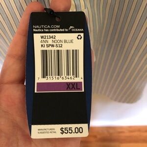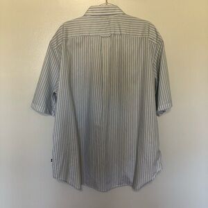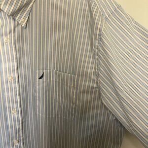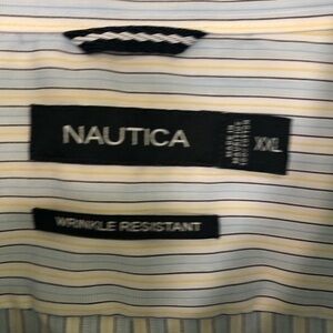 New with tags! Nautica blue and yellow striped short sleeved button up shirt. Size xxl. Wrinkle resistant.