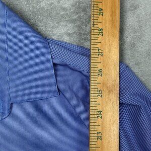 Lightweight polyester-spandex blend, classic button-down long-sleeve design featuring a micro-check pattern in blue. Slim fit, breathable stretch fabric. Machine washable, made in China.