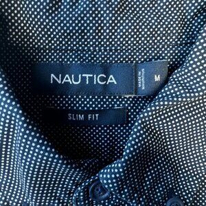 Elevate your professional or evening wear with this tailored Nautica Slim Fit shirt. It features a rich Navy Blue color with a subtle, yet stylish all-over white dotted print. The slim fit cut offers a modern, flattering silhouette. A versatile, high-quality shirt perfect for business casual or dressing up for dinner.