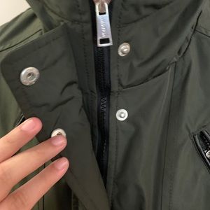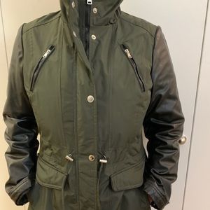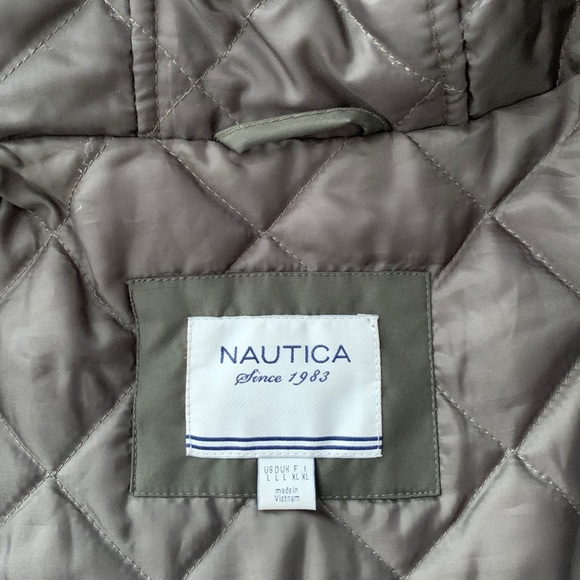 This Nautica jacket was only worn once and is in perfect condition. Sleeves are faux leather for an upscale fashionable look. Perfect for fun Spring days to keep warm and stay dry. Arm length 21 inches, height 22 inches, waist 40 inches