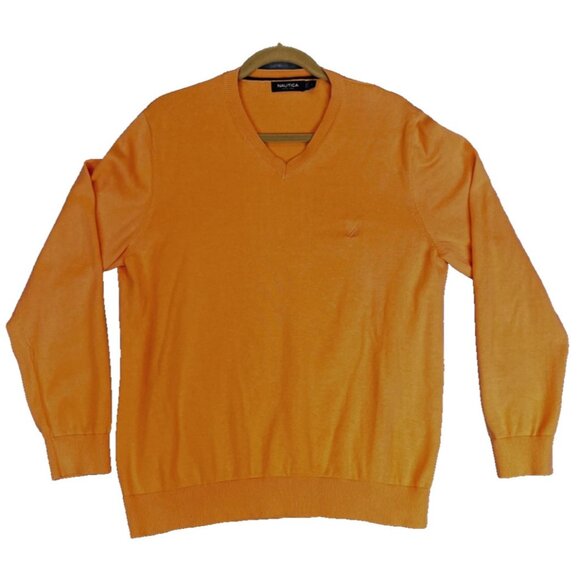 Nautica Sweater Mens Large Orange V Neck 100% Cotton Pullover Lightweight Knit