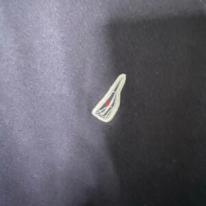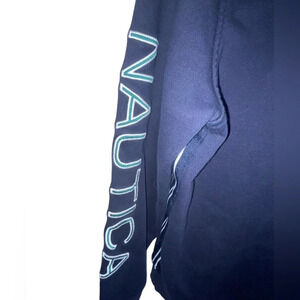 Says Nautica down the left sleeve, has stripes down both sides, small logo on the front