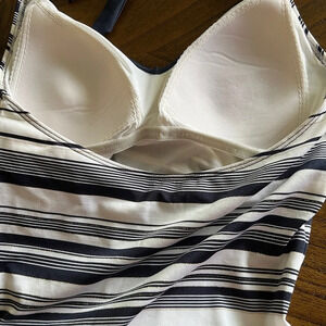 Nautica 2-piece tankini swimsuit set in classic navy and white stripes. Includes a V-neck tankini top with built-in shelf bra and matching navy swim skirt bottom. Comfortable, flattering fit with sporty-chic vibes. New with tags. Size 8.