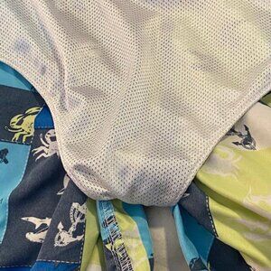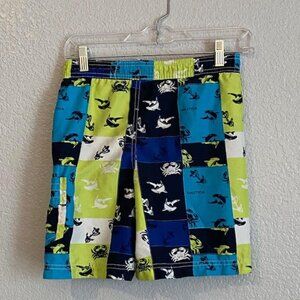 This is a pair of Nautica Trunks Bermuda Shorts Youth Boys Swim Breathable Beach Drawstring Sz 7X. These are lime green & blue patchwork with sea creatures. These shorts are in good pre-owned condition.
