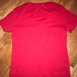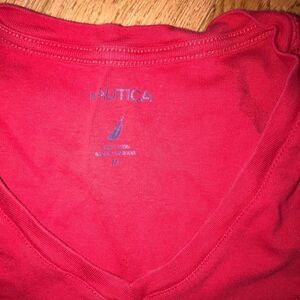 Red v-neck cotton tee by Nautica. Normal wear. Does have very tiny spot on back.