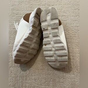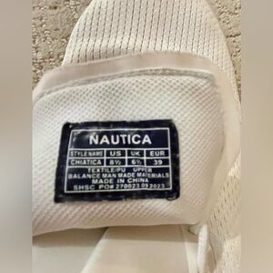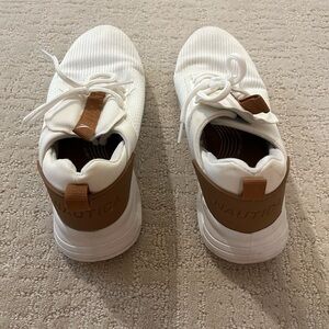 Experience the perfect blend of style and comfort with Nautica's white and brown sneakers. Featuring a minimalist design, these sneakers boast a cushioned collar and a lightweight construction, making them ideal for everyday wear. The neutral color palette ensures versatility, effortlessly complementing any casual outfit. Women’s size 8 1/2. Good preowned condition