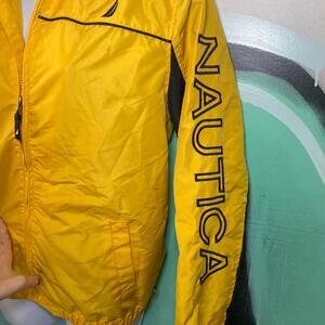 yellow, windbreaker, Nautica, sporty, logo detail, adjustable hood, zipper front, lightweight, streetwear, retro
