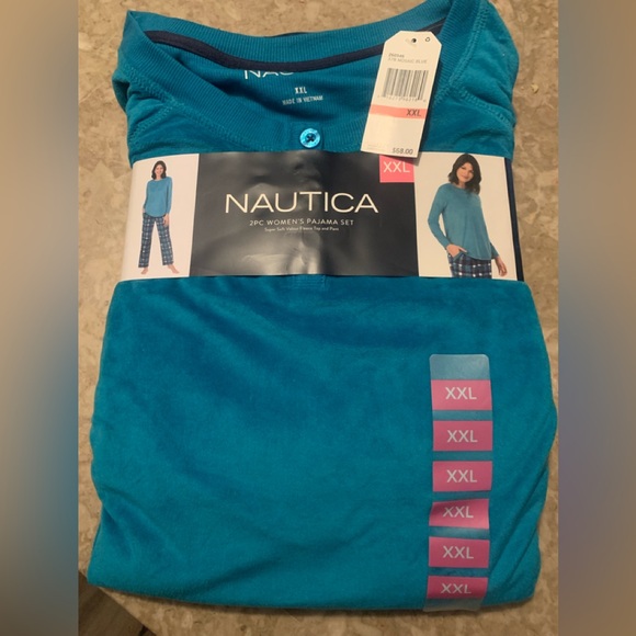 Nautica women's pajama set in mosaic blue. Features a cozy long-sleeve top and matching pants. Size XXL.