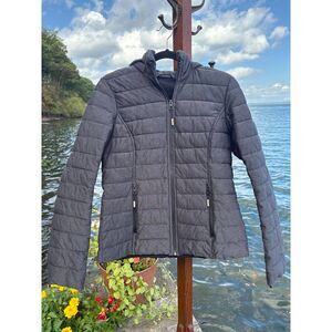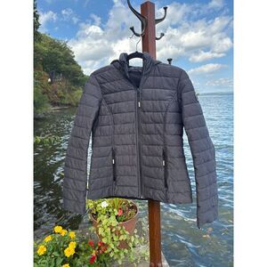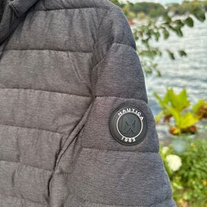 Nautica Women’s Dark Grey Puffer Jacket XS, Detachable Hood, Quilted + Insulated