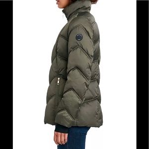 Knit thumbhole cuffs lend a sporty vibe to this cozy puffer coat from Nautica, designed with faux-fur trim around the hood for a luxurious touch.