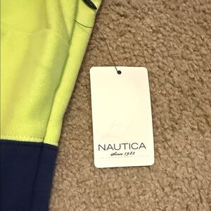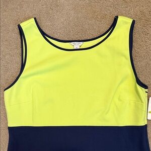 Chic color block mini dress with a bright yellow top and deep navy skirt. Ideal for a standout look. Zippers on the side.