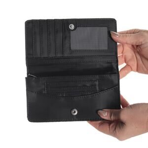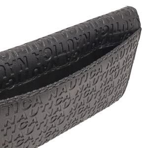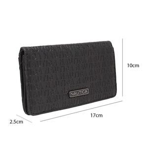 Sophistication and functionality combine in this elegant black flap wallet, designed for those seeking style and practicality in a single accessory. Its refined texture with a pattern alluding to the brand adds a distinctive touch, while the metallic detail on the front enhances its exclusive design. Inside, it offers an organized space for bills, multiple card slots, and a special coin compartment, ensuring maximum convenience for everyday use. It also features an external sliding compartment on the back, ideal for quick access to frequently used documents or cards.