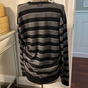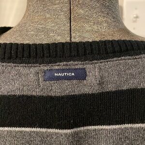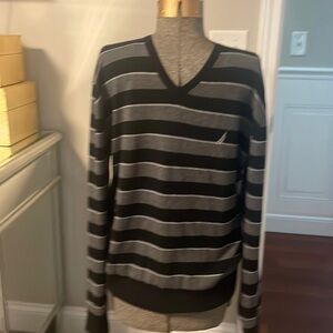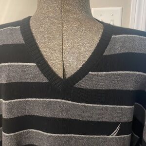Nautica mens grey & black striped v-neck sweater size large in good pre-owned condition (cotton & cashmere)
