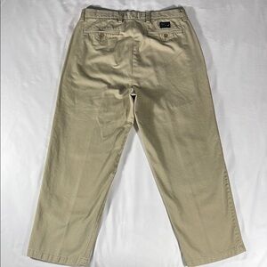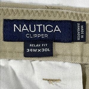 Good condition, a lot of life left, rugged material, 100% cotton, khaki color, Clipper Relax fit, flat front, zipper fly, button closure, embroidered Nautical tag above rear button pocket, 28" inseam 36" waist (actual measurements pictured)