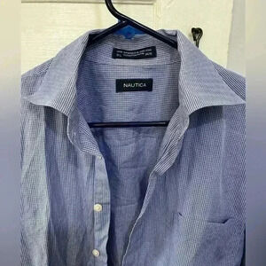 purple and light blue super small checkered design on a long sleeve button-down dress shirt from nautica
