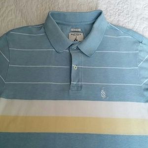 Gently used Nautica Polo. It has a very small stain on the white part, which can be easily removed with bleach. Barely worn. Slim fit.