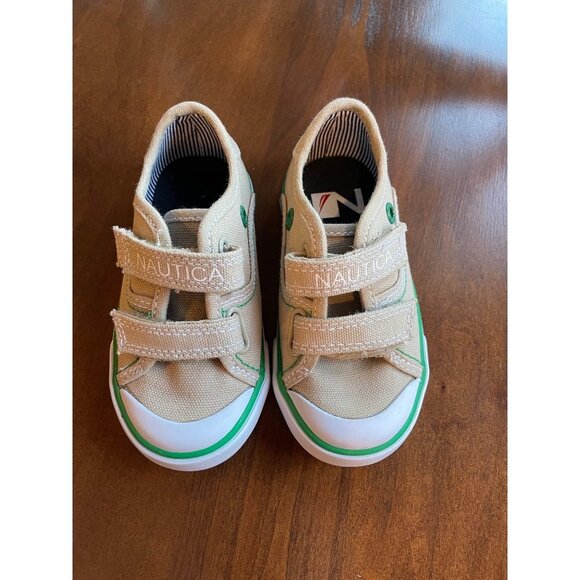 Cute cream and green Nautica shoes with Velcro straps. Toddler size 6. In good condition.