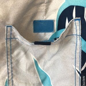 Nautica men’s swim trunks size 38 waist blue, light gray turquoise & navy. 100% polyester. Back pocket with Velcro closure. Inside key pocket.