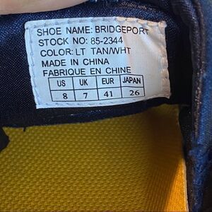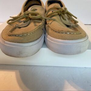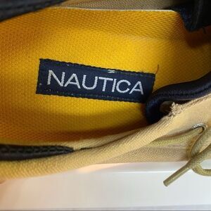Nautica Beige Bridgeport Boat Shoes. Excellent used condition. Size 8. White rubber outsoles. Front lace ties.