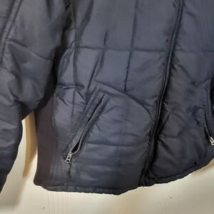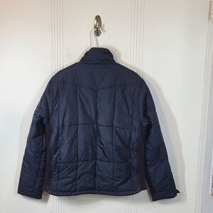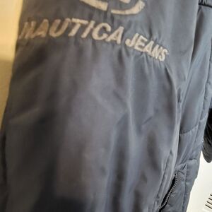 Nautica Jeans men's jacket. Size medium. Zips in the front with two front pockets & two back pockets. Dark blue color. Slight wear on the collar.