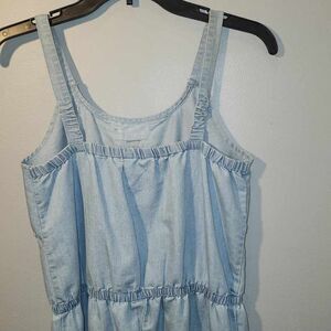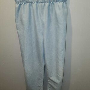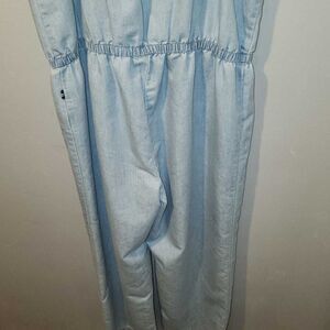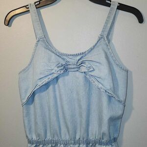 Girls 12/14 lightweight chambray denim jumpsuit has bow detail on chest elastic waist and cuffs. Pull on no zipper.