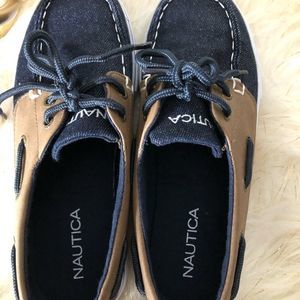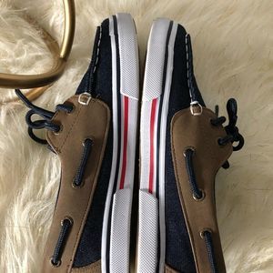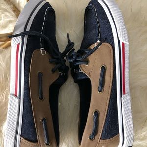 Gently used, worn 1 time. Demin and tan mix tie lace up. Smoke and pet free home. With box