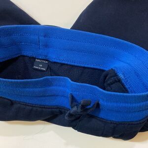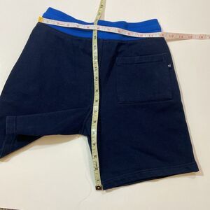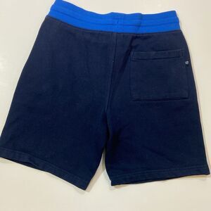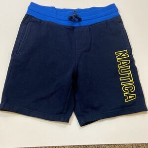 Nautica shorts in navy with a blue waistband. Features yellow lettering on the side.