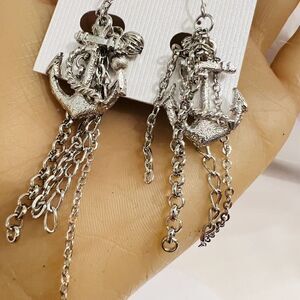 Nautical Anchor Dangle Earrings Drop Pierced Silver Tone Chains 3.5”