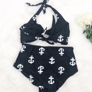 Nautical Anchor Swimsuit Retro Black White Halter High Waist