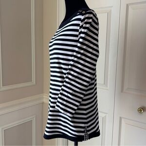 Chic Rafaella top with bold black and white stripes. The top is a Rafaella women's striped top with button details on the shoulders, called the "Women's Stripe Rivet Detail Layered Top" or "Women's Candy Stripe Button Detail Top" by Rafaella. Decorative metal buttons along the shoulders, adding a distinctive embellishment to the neckline area. Comfortable. Classic Fit. Made of comfortable fabric: it’s 100% cotton. Easy to style. Ideal for layering. Great for traveling or everyday style. In perfect condition, from nonsmoking household.
