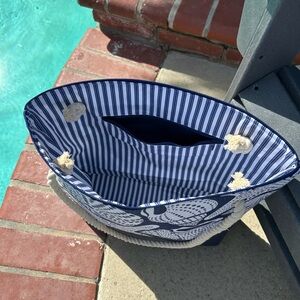 Stylish tote bag with a nautical theme. Features a blue and white seashell pattern. Rope handles add a coastal touch. With travel strap. Hand crafted