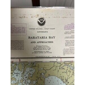 Laminated Department of Commerce NOAA nautical chart/map of Louisiana’s Barataria Bay and Approaches measuring 36” x 48. The laminate is peeling around the edges.