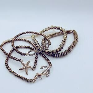 Nautical Gold Toned Beaded Bracelet Set featuring this fun nautical and starfish design included in this fun, beautiful set. Perfect for adding a touch of sophistication to any outfit. Great Preloved Condition, Like New only worn a couple times.