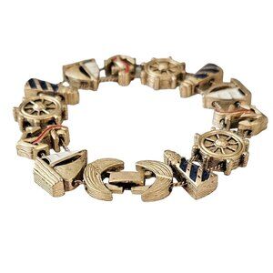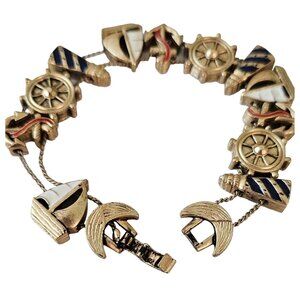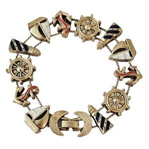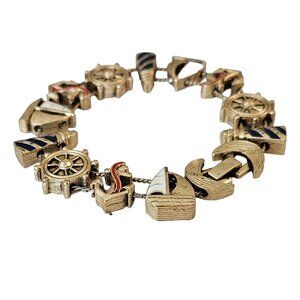 This Nautical Lighthouse Anchor Sailboat Slider Charm Bracelet conveys a great sense and emotional appreciation for the symbol of an anchor and nautical-inspired designs. It presents a stylish appeal, making it an ideal present for a sailor or a loved one. This bracelet is composed of two sturdy chains with charms that slide along the inset chains. The charms are crafted from a matte gold tone base with intricate design and accented with nautical colors red, white, and navy blue enamel details. These charms include a sailboat, anchor, lighthouse, and a captain's wheel placed alternately. This delightful bracelet measures 7 inches long, secured with a fold-over hinged clasp which is strong, reliable, and easy to use. It is a versatile accessory suitable for various occasions, from casual outings to more formal events.