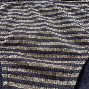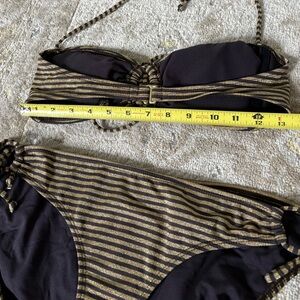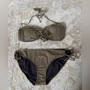Nautical Metallic Gold Stripe Bikini Set. Bottoms are large and top is medium and has removable pads. Gray and gold. Very good condition, much prettier in person.