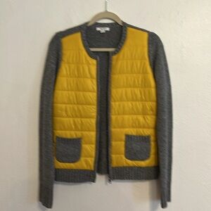 Nautical size small knitted grey sweater with bright yellow puffer panels and small grey pockets on the front; full zip crewneck.