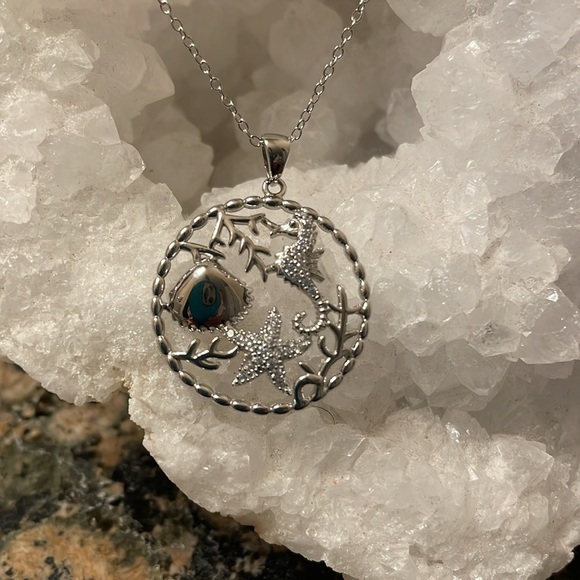 This elegant silver pendant necklace features intricate detailing. Sterling silver stamped 925. Lovely seahorse and starf filled with spar Austrian crystals. The sea shell has an intricate scalloped edge. Surrounded by coral branches and a twisted nautical rope design circling this beautiful piece. Comes on a Sterling silver open link chain as show with lobster clasp. Also available are box chains in 16”, 18” or 20”. These have a spring clasp. Comes gift boxed as shown. This piece is a unique treasure! Retail 155.00. NWT. I ship mostly same day weather permitting.