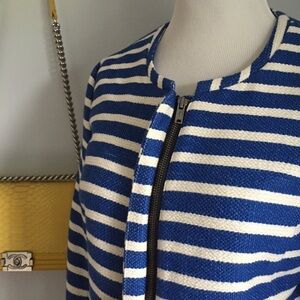 Beautiful blue and off white striped blazer / jacket. Full zipper closure in front. Fully lined. Excellent condition.
