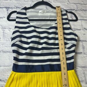 Elegant maxi dress with navy/white striped bodice and a bright yellow pleated skirt. Dress has elastic waist in the back and crisscross . Ideal for casual outings.