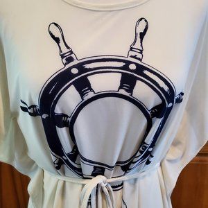 Very cute lightweight swimsuit cover up with a ship wheel theme. The material is soft and has a nice slip to it. It has never been worn (took tags off to steam out wrinkles.) Any flaws I could find are pictured and this was purchased with these flaws as it is new. Can be sinched around the waist or worn loose! Let me know if you have any questions. I typically ship same/next day.