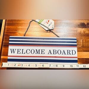 Nautical sign with 'Welcome Aboard' text. Features blue, red, and white stripes. Perfect for home decor.