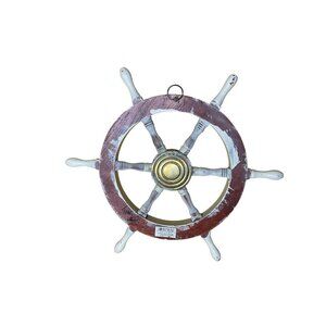 Enhance interiors with this nautical-inspired ship wheel decor. Crafted from wood with a distressed finish and brass accents, it adds maritime charm.