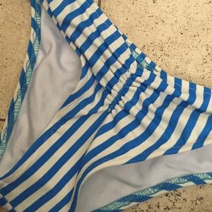 Brand new (hygienic liner still in the bottoms) bikini set. Top is a tie back bandeau style with halter straps. Bottoms have a cute scrunch in the front with a medium coverage back. Top size small bottoms medium