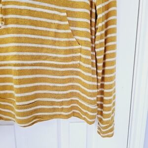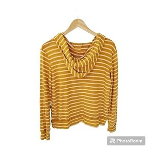 Stripe soft mustard yellow and white hoodie knit light sweater top Rayon polyester and spandex materials, kangaroo pocket, drawstring Flat lay measurements: 20.5" pit to pit, 22" length size small NWT, no smoking