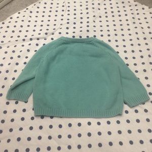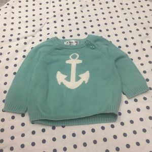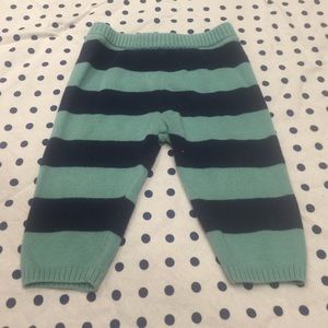 Mint green knitted sweater, long sleeve, with front white anchor logo and two shoulder buttons. Mint green and navy blue stripe knitted sweater pants with ribbed waistband and hem. Come from non-smoking and non-pet home.