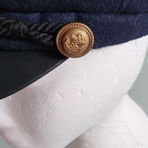 Navy Blue with black bill, twisted cord with nautical anchor buttons. Hatbin1.0111