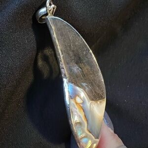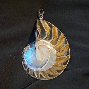 Elegant nautilus shell pendant with sterling silver accents. Perfect for ocean lovers. There is a small crack in the resin. 2.5” long & 2” wide.
