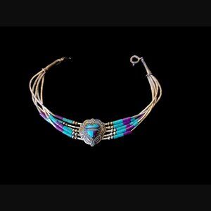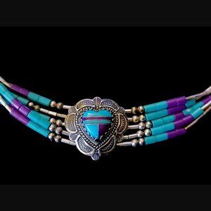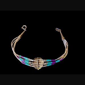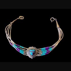 Add a touch of elegance to your wardrobe with this beautiful Navajo 925 sterling silver liquid silver 5 strand turquoise heart bracelet. The bracelet features a heart-shaped design and is adorned with stunning turquoise stones, making it a perfect accessory for any occasion. The bracelet is 7.25 inches long and is crafted with high-quality materials, ensuring durability and longevity. Whether you are looking for a gift or want to treat yourself, this bracelet is a perfect choice.